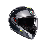 An AGV icon, evolving towards perfection. K3 is AGV’s full-face road helmet that takes all the characteristics of a versatile, safe helmet to outstanding levels. It offers safety for all, at the highest levels – the shell made of high-resistance thermoplastic material, the multi-density EPS and the details such as the collarbone-protection profile and the protective visor allow K3 to obtain the strict ECE22.06 homologation. Due to the AGV Extreme Safety construction protocol, K3 meets the requirements of the most recent international standards and then some. Its strength lies in its versatility. K3 is designed to put in its best performance in all situations. The built-in sun visor, which can be operated conveniently with gloves on, assists when it’s too bright, and doesn’t block the front ventilation when it’s in the rest position. The Pinlock Max Vision antifog system guarantees maximum visibility even on the wettest and coldest days, when the temperature difference between the environment and the inside of the helmet could cause the visor to fog up dangerously. Not with K3. The Ultravision visor also guarantees a 190° horizontal field of vision, so you can see obstacles, the road and everything in front of you earlier and better. K3 is prepared for the installation of communication systems. The Eyewear Ready interior design allows you to comfortably wear your eyeglasses or sunglasses while riding. Comfort boosts performance. The aerodynamic profile of the K3 is designed to achieve a dynamic weight of zero at a cruising speed of 130 km/h. It means lower weight and less strain on the neck muscles, for maximum concentration on riding. The interiors, made of 2DRY material with rapid absorption of sweat and moisture, can be customized, to personalize the fit to the full and maximize how comfortable it feels. The ventilation achieves maximum efficiency through the air vents at the front and on the chin, precise and easy to operate with gloves on. The practical micrometric steel closing system permits quick, safe adjustment of the helmet fastening.