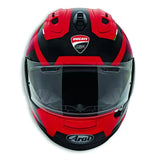From the collaboration with Arai comes an exclusive helmet inspired by the graphic themes of MotoGP. Boasting a design and performance worthy of queen class. The bold and iconic Ducati red is juxtaposed with burgundy, fluorescent red and black to create an eye-catching look, with chromatic inserts capable of creating a refined and gritty style that will not go unnoticed. The powerful and aggressive design of the Ducati Corse V6 helmet, created by Drudi Performance exclusively for Ducati, is perfectly matched with its excellent technical characteristics, specifically designed for sports riding. Maximum safety thanks to the outer shell made of composite fiber, which protects the rider from impact and dissipates the energy of the impact and the “Peripherally Belted” structure that makes it even more resistant. The inner shell is also masterfully and impeccably manufactured, and it is patented and made of multiple-density EPS changing its compactness depending on the position. The thermoformed, CE-certified visor is scratch-proof and anti-fog, and it offers the rider an extended field of vision thanks to the VAS technology, while the wider size ensures perfect peripheral vision. Maximum comfort and excellent riding sensitivity thanks to the FCS system, which offers an extremely comfortable fit, the advanced opening mechanism derived from the car industry and excellent ventilation, for maximum stability and efficiency even at high speeds. Finally, the detachable inner liner made with fine Eco-Pure® hypoallergenic fabric and the ventilated and replaceable neck padding complete the outfit. Top-of-the-line performance, excellent safety and distinctive racing design.
